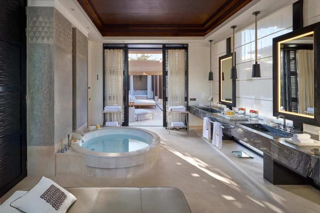Il Mandarin Oriental, Marrakech si distingue per la sua architettura arabo-berbera, un'estetica elegante che si fonde armoniosamente con l'ambiente naturale. I visitatori possono scegliere tra 54 ville private, ciascuna con la propria piscina e jacuzzi, offrendo la massima privacy e un comfort ineguagliabile. Anche le 9 suite dell'hotel sono eccezionali, con 7 che dispongono di una piccola piscina sul tetto, perfetta per rinfrescarsi ammirando il panorama.