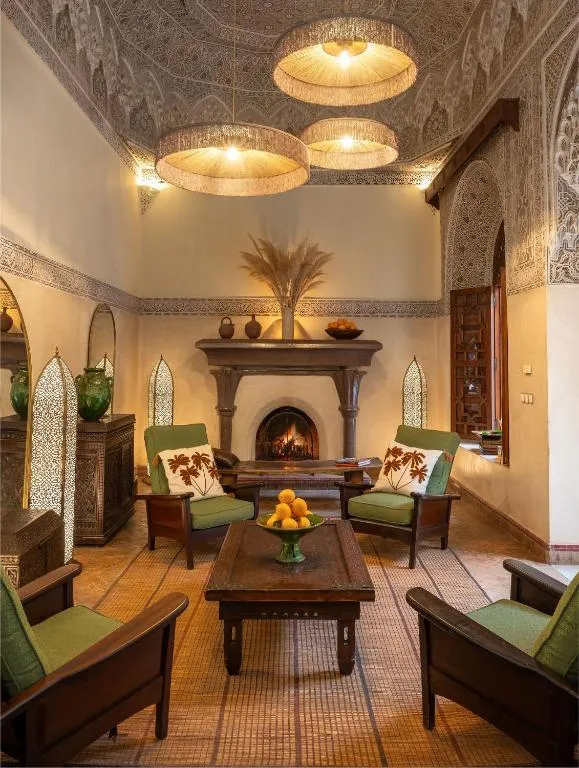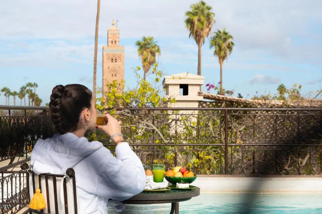 El hotel se destaca por sus tres patios exuberantes salpicados de naranjos y adornados con piscinas refrescantes, que invitan al relajamiento bajo el sol de Marrakech. Los viajeros pueden encontrar un espacio de paz lejos del bullicio de la ciudad, donde el aroma de las flores de naranjo embriaga la atmósfera.