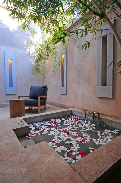 La piscina exterior, rodeada de tumbonas cómodas, es el corazón de Palais Namaskar, invitando a los huéspedes a relajarse bajo el sol marroquí. Para una relajación más profunda, el centro de bienestar ofrece una multitud de tratamientos y terapias para revitalizar el cuerpo y el espíritu.