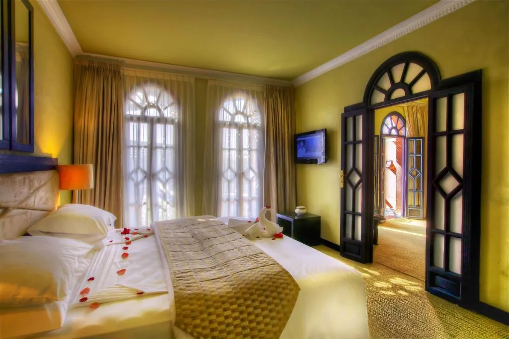 The Eden Andalou Suites, Aquapark and Spa is a haven of peace. Here is a brief description of the hotel. The Eden Andalou Suites, Aquapark and Spa hotel is located in Marrakech and 11 kilometers from El Badi Palace. This place is very warm with 250 suites that are all equipped with relaxing bathtubs, minibars, very comfortable beds, etc. Also, the establishment has two great restaurants that offer you delicious local and international dishes. In addition, there are spas available for your body treatments. Hotels with swimming pool s do exist in the area, but this one has one indoor pool , four outdoor pool s and one for children. There is also a free water park, an artificial river, a whirl pool and a steam room. Although it is large, the hotel is very secure. Surveillance cameras are everywhere. Moreover, the customers are welcomed and well treated throughout their stay. Also, the hygiene is assured especially in this period of health crisis. The wifi connection is free as well as the parking. There are banking services, a hairdressing salon, places to practice different types of sports, etc.