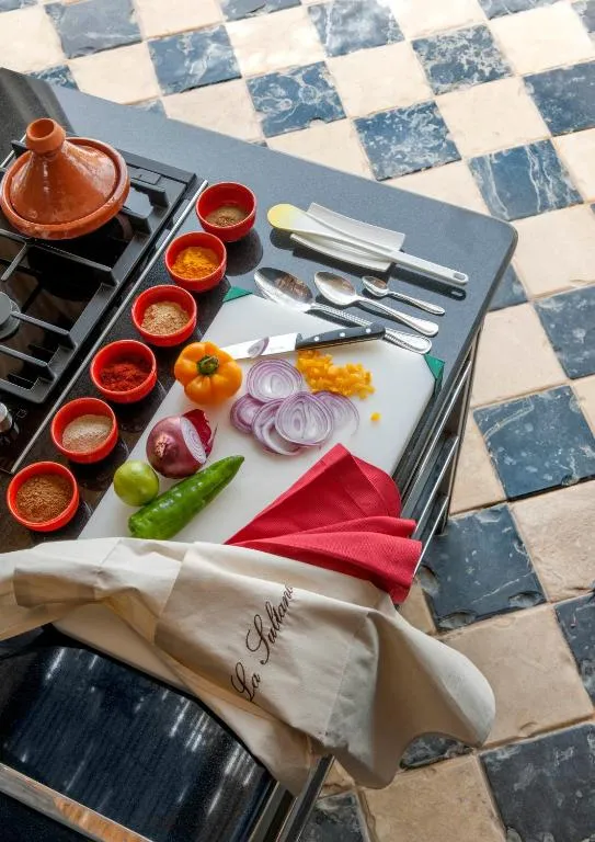 Les Jardins de la Médina is a romantic boutique hotel located in the centre of Marrakech in the Cherifian Kingdom. It is located close to iconic places such as Jamaâ El Fna Square, the Riad and Marrakech Airport. It features beautiful exotic gardens, an outdoor swimming pool, a spa and a wellness area. Les Jardins De La Medina features modern rooms that are both soundproofed and air-conditioned. Each room has a beautiful balcony overlooking the garden and swimming pool, a private bathroom, free Wi-Fi and a new generation satellite TV. Les Jardins De La Médina is also renowned for its culinary creations through its bar-restaurant. The latter prepares both Moroccan and Mediterranean flavours. It also offers cooking classes to the delight of meal lovers. The leisure aspect of this hotel is not to be neglected. Indeed, there is an outdoor swimming pool, a luxuriantly beautiful exotic garden and a spa with hammam and beauty treatments.